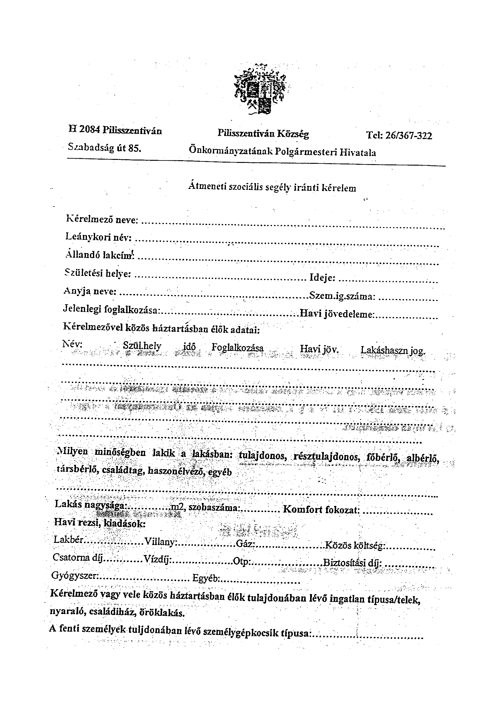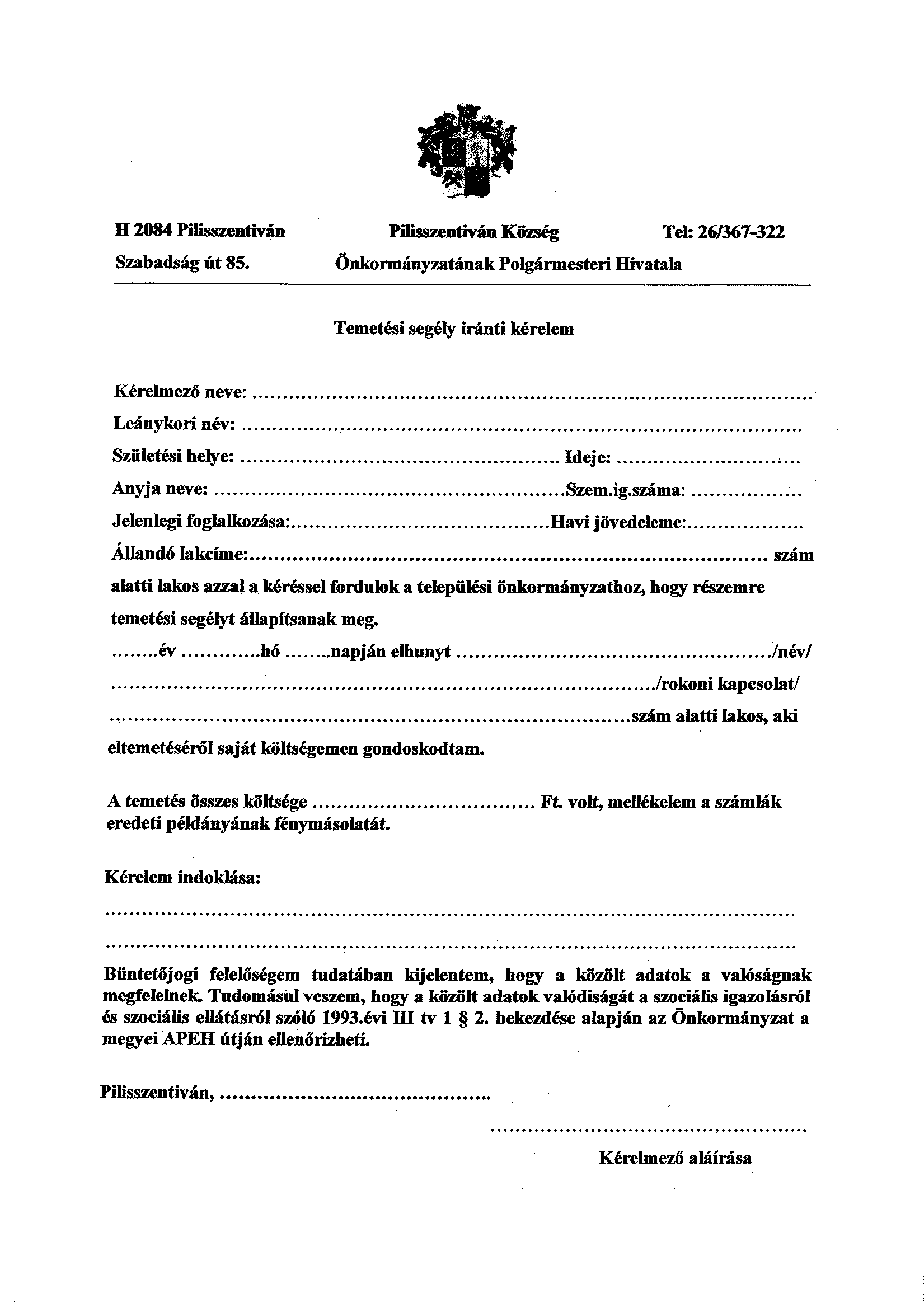 Településképi nyomtatványok Adózási nyomtatványok Kérelem kutak vízjogi üzemeltetési és fennmaradási engedélyezési eljáráshoz (szerkeszthető) Téli rezsicsökkentés igénylőlap Bejelentés a hulladékgazdálkodási közszolgáltatás igénybevételével kapcsolatos adatokról Anyakönyvi kivonat kiállítása iránti kérelem Növénytelepítési bejelentő Fakivágási és növénytelepítési engedély Vállalkozók netto árbevételének kiszámítása Temetési segély Tehetséggondozási támogatás iránti kérelem Jegyzői igazolás lakásépítési kedvezmény és lakáscélú hitel igénybevételéhez Átmeneti szociális segély iránti kérelem